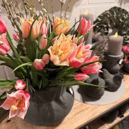 Ein frisches prachtvolles echt aussehendes Tulpenbund in der Farbe beauty. Mit diesem Tulpenstrauß holen Sie sich einen frischen blumigen Look ins Haus. Durch die Wasserbeständigkeit der Tulpen, können Sie den Strauß auch in eine Vase mit klaren Wasser stellen und mit weiteren Blumen kombinieren, welche seine täuschend echte Optik noch mehr unterstreichen lässt.