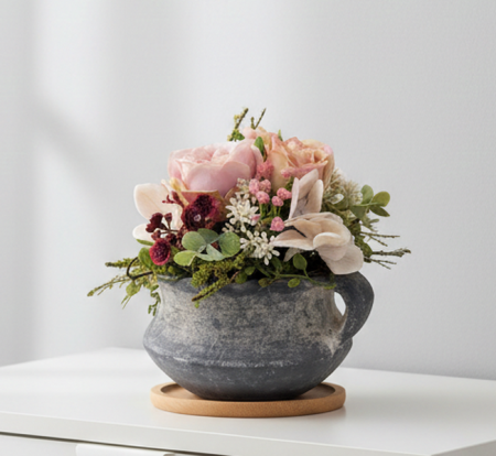 Dieses liebevoll gestaltete künstliche Blumenarrangement bringt eine frische und zugleich natürliche Atmosphäre in Ihr Zuhause. Zarte Rosen in sanften Rosatönen, kombiniert mit filigranen Blüten und frischem Grün, sind harmonisch in einer stilvollen, rustikalen Brynxz Schale arrangiert. Die Kombination aus romantischen Farben und natürlicher Optik macht dieses Gesteck zu einem echten Blickfang – perfekt für Wohnzimmer, Essbereich oder als besondere Geschenkidee. Ob als dekoratives Highlight auf dem Tisch, für festliche Anlässe oder als langlebige Alternative zu frischen Blumen – dieses Arrangement überzeugt durch zeitlose Schönheit und hochwertige Verarbeitung. Ideal als Tischdekoration oder Geschenk Pflegeleicht und langlebig . Perfekt für moderne, romantische oder natürliche Wohnstile.