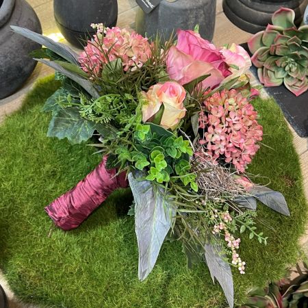 Dieses frühlingshafte Gesteck bringt Frische Ihren Wohnraum. In einem verzierten Topf wurde das Blumengesteck liebevoll von unserer Floristin arrangiert. Rosen, Hortensien, Sukkulenten Farn und Blätter wurden harmonisch aufeinander abgestimmt und sorgen für ein stimmiges Gesamtbild. Ob auf dem Tisch, der Kommode oder im Wintergarten wird dieses Gesteck ein stilvoller Hingucker.