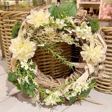 Dieser liebevoll gestaltete Dekokranz bringt Eleganz in Ihr Zuhause. Kombiniert mit verschiedenen Blüten in der Farbe cream gehalten, Moos, Blättern,und feinen Zweigen verleiht dieser Kranz Frische in Ihren Wohnraum oder Eingangsbereich.