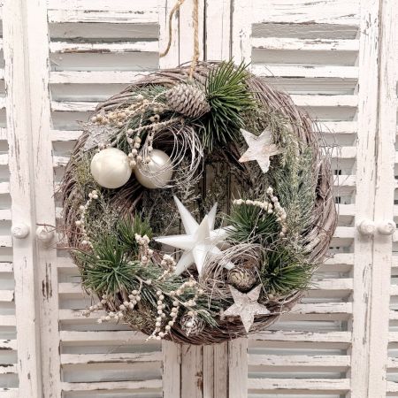 Bringen Sie festliche Stimmung in Ihr Zuhause mit diesem liebevoll gestalteten Weihnachtskranz. Der Kranz ist aus naturbelassenen Zweigmaterial gefertigt und mit winterlichen Elementen in silber und weiß dekoriert. Kleine Tannezweige, Sterne und Zapfen sowie glänzende Kugeln verleihen diesem Kranz einen eleganten und zugleich gemütlichen Look. Ein besonderes Highlight ist der warm leuchtende LED-Stern, der den Kranz sanft erstrahlen lässt - perfekt für die Haustür oder als Wanddeko. Für den LED-Stern benötigen Sie 3XAA Batterien. Diese sind in der Lieferung nicht enthalten.