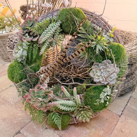 Dieser hochwertige künstliche Dekokranz überzeugt durch seine besonders natürliche Optik und die liebevolle Gestaltung. Üppig gefertigt mit Sukkulenten, Moos, Farn, feinen Zweigen, Eukalyptus und Federn. Die Federn verleihen diesem Kranz eine absolut stilvolle und moderne Note. Ein idealer Wandkranz oder als besonderer Akzent im geschützten Außenbereich. Unsere Floristin hat diesen Kranz mit viel Liebe zum Detail für Sie handgefertigt.
