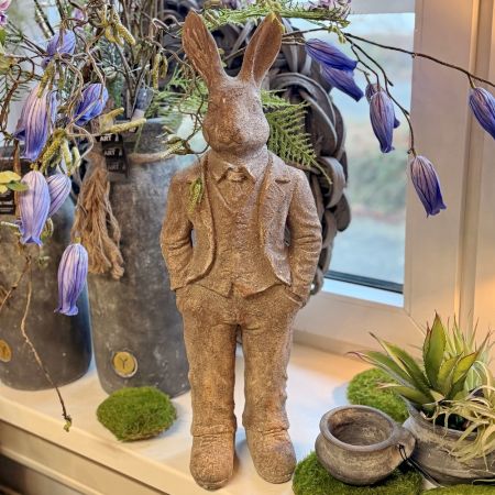 Ein absolut dekorativer Dekohase im Anzug. Der Hase ist detailreich gestaltet und hat lässig die Hände in der Tasche. Die strukurierte Oberfläche verleicht der Figur einen rustikalen, hochwertigen Charakter und macht diesen Dekohasen zum echten Blickfang. Der Hase ist aus Polyresin hergestellt.