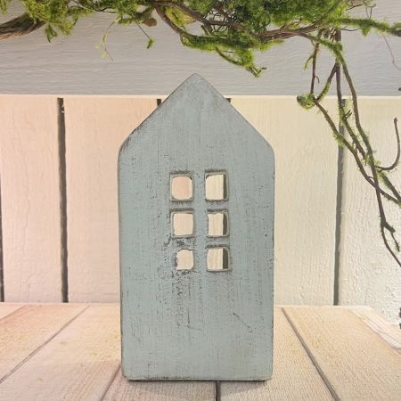 Dieses Teelichthaus in der Farbe hellblau in gewischter Optik ist eine hübsche Dekoration für Ihren Wohnraum. Auf der Rückseite des Lichterhauses gibt es einen offenen Bereich, wo Sie ganz einfach ein Teelicht oder eine Lichterkette platzieren können. Ein zeitloses Dekoaccessoires, welches zur Gemütlichkeit in Ihrem Raum beiträgt. Durch das Licht zaubert das Dekohaus eine leuchtende Atmosphäre und ist für jeden Raum ein kleines Highlight. Auch eine schöne Geschenkidee, vielleicht zum Einzug in ein neues Haus oder Wohnung. Das Haus ist aus Steingut hergestellt, jedes Häusschen ist einzigartig und kann daher leicht vom anderen abweichen.