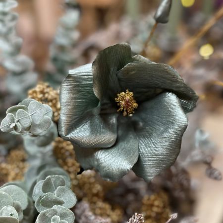 Dies ist ein schöner künstlicher Hibiskus in einem traumhaften blau/ grün metallic Ton! Die Blüten sind aus Textil und sehen wunderschön aus! Zeitlos und edel ist dieser Hibiscuszweig. Mache diesen Hibiskus zu einem echten Eyecatcher in einer Vase dekoriert mit anderen Blumen oder einzelnd.