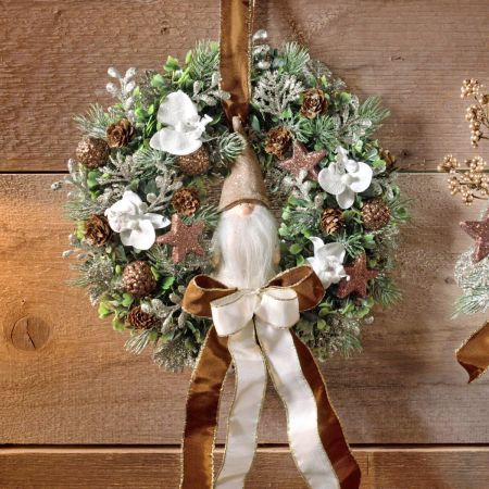 Ein süßer Türkranz besetzt mit einem Wichtel, glitzernden Sternen und Zapfen sowie weiteren Blattwerk und weihnachtlich glitzernden Dekomaterial. Der Türkranz der Marke Tewa lässt sich im Handumdrehen im Wohnraum aufhängen. Auch an der Haustür setzt dieser Wichtel Kranz weihnachtliche Akzente.