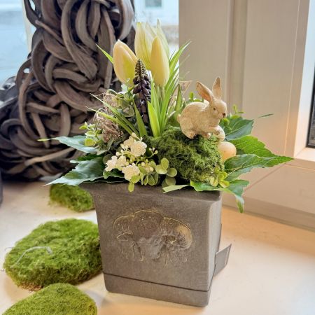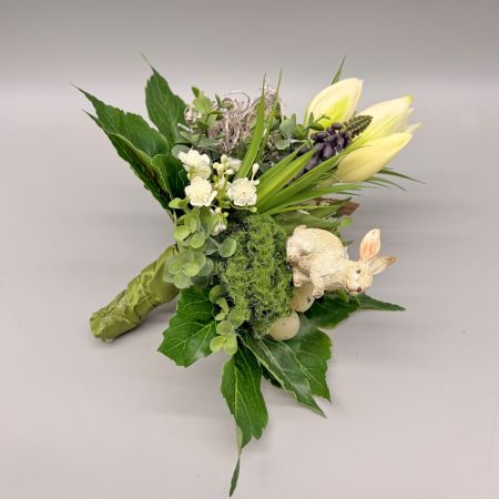 Dieser künstliche Strauß wurde liebevoll von unserer Floristin gebunden. Arrangiert mit einer Tulpen, Muscari, Schleierkraut, Eukalyptus, Eiern und einem Hässchen bringt dieser Strauß Ihre Vasen zum absoluten Hingucker. Die Farben sind alle harmonisch aufeinander abgestimmt. Gefertigt aus hochwertigen, langlebigen Materialien ist dieser Frühlingsstrauß pflegeleicht, allergikerfreundlich und jahrelang wiederverwendbar. Ideal für Ihre Vasen. Die Lieferung enthalt nur den Strauß und keine Vase wie auf dem Fotobeispiel abgebildet.
