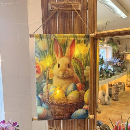 Dieses süße dekorative Bild welches durch kleine LED´s beleuchtet wird auf Rolle mit einem Aufhängeband bringt frühlingshafte und österliche Stimmung in Ihr Zuhause. Das süße Stoffbild zeigt einen niedlichen Hasen mit einem Korb voller bunt bemalter Eier, umgeben von leuchtenden Tulpen und frischem Grün. Ein tolles Motiv zur Osterzeit. Das Bild ist an dekorativen Holzstäben befestigt und mit einem Aufhängeband versehen, so dass es sich ganz einfach aufhängen lässt. Auf der Rückseite können Sie das Bild durch einen Klettverschluss öffnen und das Batteriefach bedienen. (2AA Batterien sind für das LED Bild erforderlich, diese sind in der Lieferung nicht enthalten.