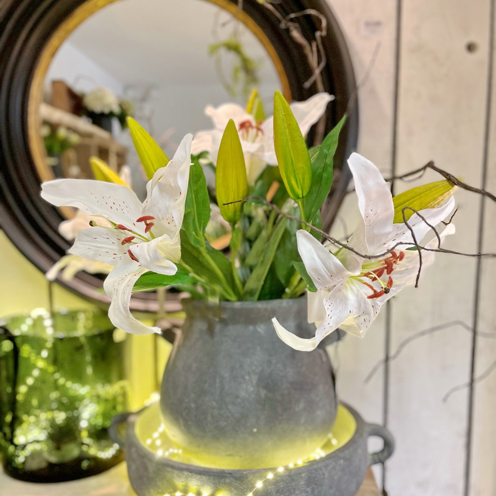 Ein sehr schöne edle Lilie Stargazer in der Farbe weiß. Die Lilie hat eine große Blüte und zwei Knospen sowie Blätter. Mit dieser Lilie können Sie für eine schöne Blumendekoration sorgen.