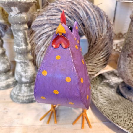 Bringen Sie den Frühling ins Haus mit diesem Metallhuhn in der Farbe dunkellila mit orangen Punkten. Langlebig und vielseitig einsetzbar – ideal für den geschützten Außenbereich oder den Wohnraum. Dieses Metallhuhn ist perfekt als frühlingsfröhliches Accessoire für jeden Wohnraum.
