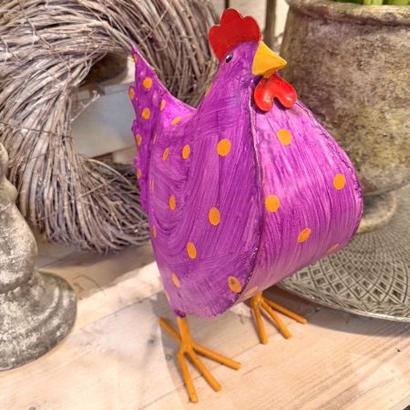 Bringen Sie den Frühling ins Haus mit diesem Metallhuhn in der Farbe purple mit orangen Punkten. Langlebig und vielseitig einsetzbar – ideal für den geschützten Außenbereich oder den Wohnraum. Dieses Metallhuhn ist perfekt als frühlingsfröhliches Accessoire für jeden Wohnraum.