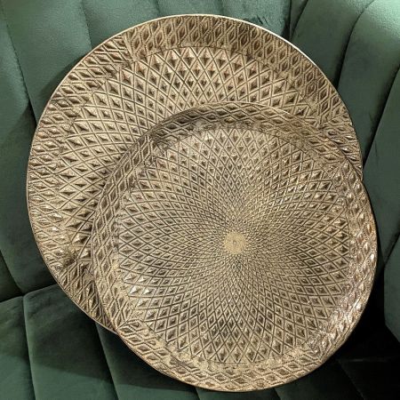 Dieses runde Metalltablett in edlem antiksilber Finish ist ein stilvolles Highlight für jedes Zuhause. Die aufwendig strukturierte Oberfläche mit feinem Rautenmuster verleiht dem Tablett/Dekoteller eine elegante orientalisch anmutende Optik.