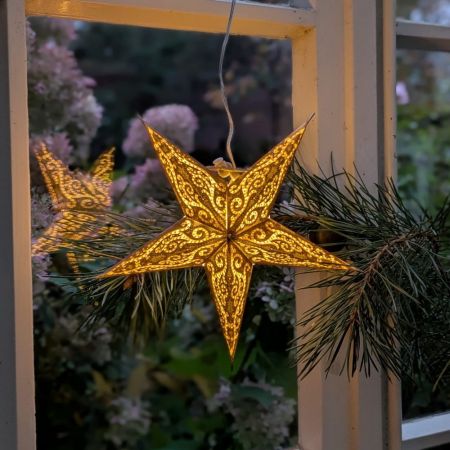 Der Mini Stern Mandala in gold/glitter ist ein stilvoller Papierstern mit aufwendigem Siebdruck, der Ihrer Dekoration das gewisse Etwas verleiht. Perfekt für Fenster, Regale, Wände oder als zartes Highlight in Kombination mit größeren Sternen. Der Stern wird aus hochwertigem Papier gefertigt und mit einem filigranen Muster im Siebdruck-Verfahren versehen – für ein besonders edles und kunstvolles Design. Der integrierte Kordel-Schnellverschluss ermöglicht ein einfaches Auf- und Abbauen. Der Stern lässt sich mit einem passenden LED-Leuchtmittel (separat erhältlich unter Artikel-Nr. 51648) stimmungsvoll beleuchten. Eine schöne Dekoration zur Advents- und Weihnachtszeit.