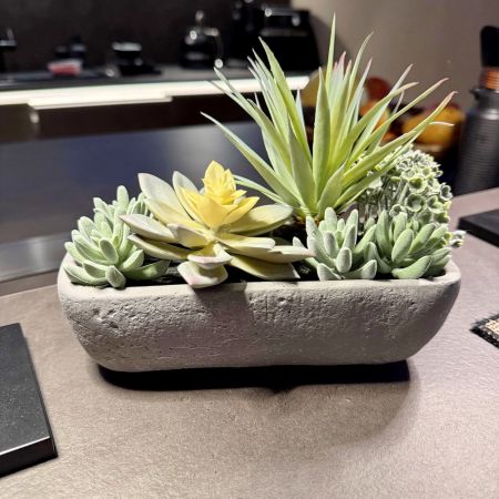Naturgetreu und wunderschön sehen die Sukkulenten im grauen Zementtopf aus. Die Sukkulenten wirken wie echt und bieten sich wunderbar zum dekorieren im Bad, Wohnraum oder Küche an.