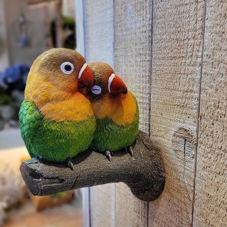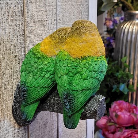 Ein sehr süßes Papageienpaar sitzend auf einem Ast sorgt für eine wunderschöne Innen- oder Außendekoration. Sie können dieses Papageienpaar ganz einfach an einer dafür vorgesehenen Hängevorrichtung an Ihrer Wand anbringen. Eine außergewöhnliche Dekoration die Ihre Blicke auf sich ziehen wird.