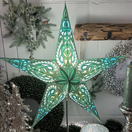 Der grüne Papierstern „Aldebaran“ ist ein stilvoller und zeitloser Weihnachtsstern, der mit seinem klassischen 5-zackigen Design für eine festliche Stimmung sorgt. Mit einem Durchmesser von ca. 60 cm ist er sowohl als Fensterdeko als auch auf einem Tisch oder Sideboard ein echter Blickfang. Der Stern besteht aus hochwertigem, bedrucktem Papier und lässt sich dank des einfachen Faltsystems schnell aufbauen. Ob zum Aufhängen oder mit einem separat erhältlichen Standfuß – dieser Papierstern ist vielseitig einsetzbar und verleiht jedem Raum eine warme, stimmungsvolle Atmosphäre. Bitte beachten: Der Stern wird ohne Beleuchtung geliefert. In unserem Shop finden Sie das passende Stromkabel für Papiersterne sowie einen stabilen Standfuß – ideal zum Aufhängen oder Hinstellen. Diese finden Sie unter folgenden Artikel-Nrn: 99930+99931+00183.