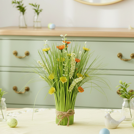 Bringen Sie frische, natürliche Akzente in Ihr Zuhause – ganz ohne Pflegeaufwand – mit diesem dekorativen Standstrauß aus künstlichem Gras und zarten Blüten. Der liebevoll gestaltete Strauß kombiniert feine, grüne Gräser mit kleinen Blüten in warmen Gelb- und Orangetönen und sorgt so für eine freundliche, frühlingshafte Atmosphäre. Mit einer Höhe von ca. 22 cm ist der kompakte Kunststrauß ideal für Tische, Regale, Fensterbänke oder als dekorativer Hingucker im Eingangsbereich. Die harmonische Farbgebung macht ihn vielseitig kombinierbar – ob als Frühlingsdeko, sommerlicher Akzent oder ganzjähriger Blickfang. Das natürliche Arrangement wird durch eine rustikale Juteband-Bindung stilvoll abgerundet. Mit dekorativem Juteband gebunden. Perfekt für alle, die natürliche Optik ohne Aufwand genießen möchten – dieser künstliche Standstrauß bringt dauerhaft frische Farbe in jeden Raum.
