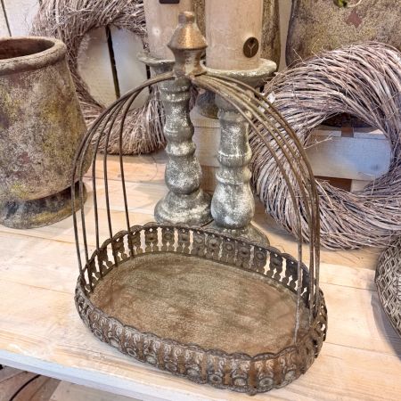 Dieses dekorative Metall Tablett ist ein stilvoller Blickfang für den Innen- und geschützten Außenbereich. Die aufwendig gearbeitete Schale mit ornaminierten Rand biete eine ideale Bühne für Pflanzen oder Dekoaccessiores. Die hohe, offen gearbeitete Käfigform macht das Tablett zu einem perfekten Dekoelement für Wohnzimmer, Wintergarten, Balkon oder Eingangsbereich. Gefertigt aus Metall, eignet sich das Pflanztablett ideal für alle die Vintage-Deko, Landhaus, oder rustikale Dekoration lieben.