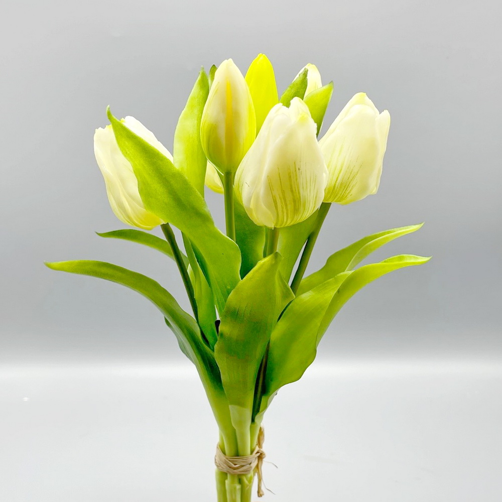 Ein unwahrscheinlich echt aussehendes Tulpenbund in der Farbe cream, bestehend aus geöffneten und geschlossenen Tulpen. Mit diesen Tulpen holen Sie sich einen frischen blumigen Look ins Haus. Durch die Wasserbeständigkeit der Tulpen, können Sie den Strauß auch in eine Vase mit klaren Wasser stellen, welche seine täuschend echte Optik noch mehr unterstreichen wird. Durch das hochwertig verarbeitete Material lassen sich die Tulpen absolut natürlich und echt anfühlen (real touch).