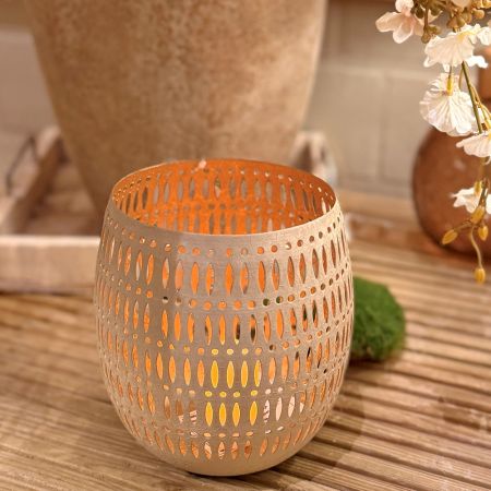 Dieses elegante Windlicht in creme/gold verzaubert mit seinem filigranen Muster und sorgt für eine besonders gemütliche Atmosphäre. Gerfertigt aus Eisen und in einem sanften Creme-/Beigeton gehalten, fügt es sich harmonisch in verschiedenste Wohnstile ein. Von modern über Landhaus bis zur Boho Einrichtung. Im inneren reflektiert die goldene Beschichtung. Ein stilvoller Blickfang auf Tischen, Sideboards oder Fensterbänken.